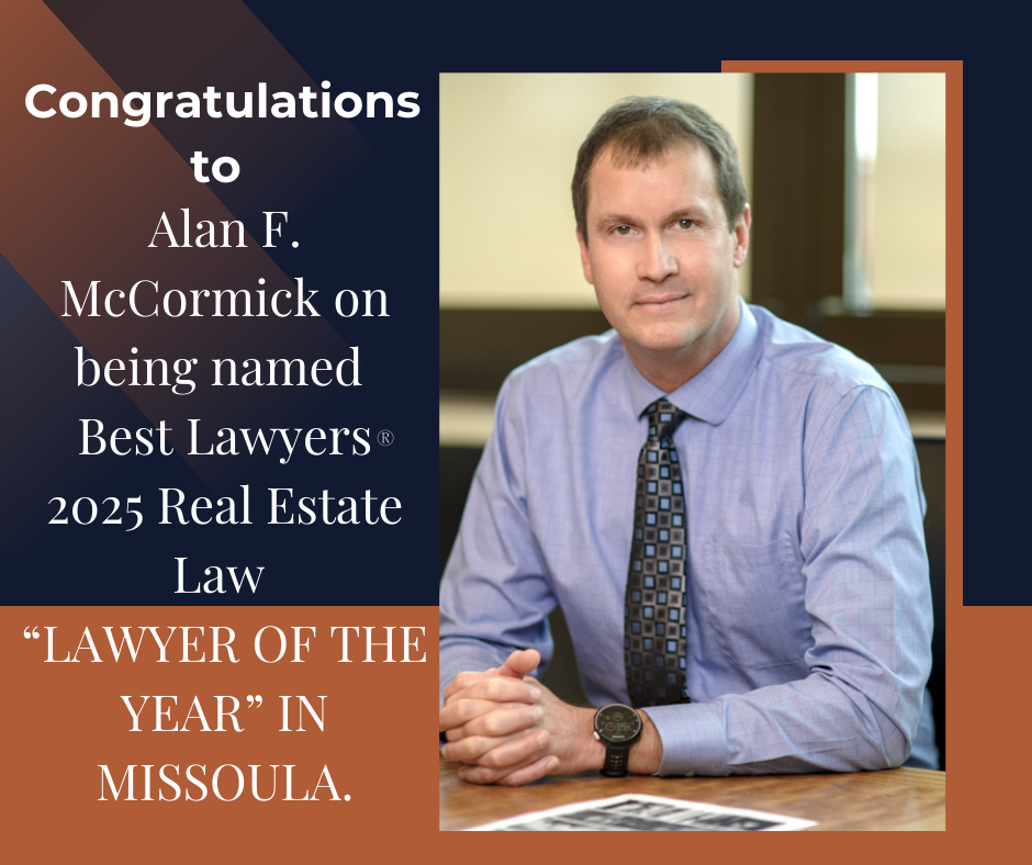 Garlington, Lohn & Robinson, PLLP attorney Alan F. McCormick was recently recognized by Best Lawyers as the 2025 “Lawyer of the Year” for Real Estate Law in Missoula.